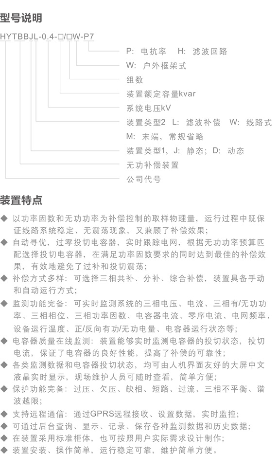 HYTBB低壓無功綜合補償裝置適用于配變、低壓線路,或其他的戶外低壓配電系統(tǒng)場合,實現(xiàn)無功自動跟蹤補償。裝置集無功補償優(yōu)化和電力監(jiān)測于一體,采用固定補償和動態(tài)補償相結合方式??蓪崟r跟蹤電網的運行狀態(tài),具有平滑的補償性能,具有最優(yōu)的補償效果。系統(tǒng)可有效補償線路無功功率,保證功率因數(shù)穩(wěn)定,降低線路損耗,提高變壓器、傳輸線路的利用率,提高負載端的供電質量。