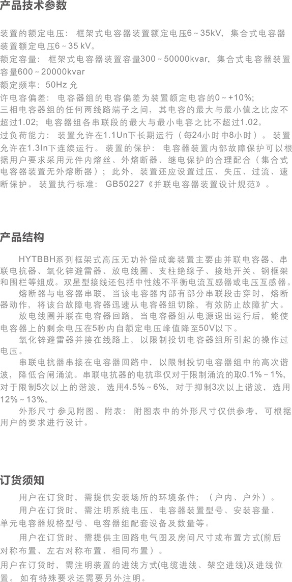 HYTBBH系列框架式高壓無功補(bǔ)償成套裝置用于6kV、10kV、 35kV系統(tǒng),并聯(lián)于電力系統(tǒng)進(jìn)行無功補(bǔ)償,以提高電網(wǎng)的功率因數(shù), 降低供電變壓器及輸送線路的損耗,提高供電效率,改善供電環(huán)境,增 加輸變電設(shè)備的輸送能力。