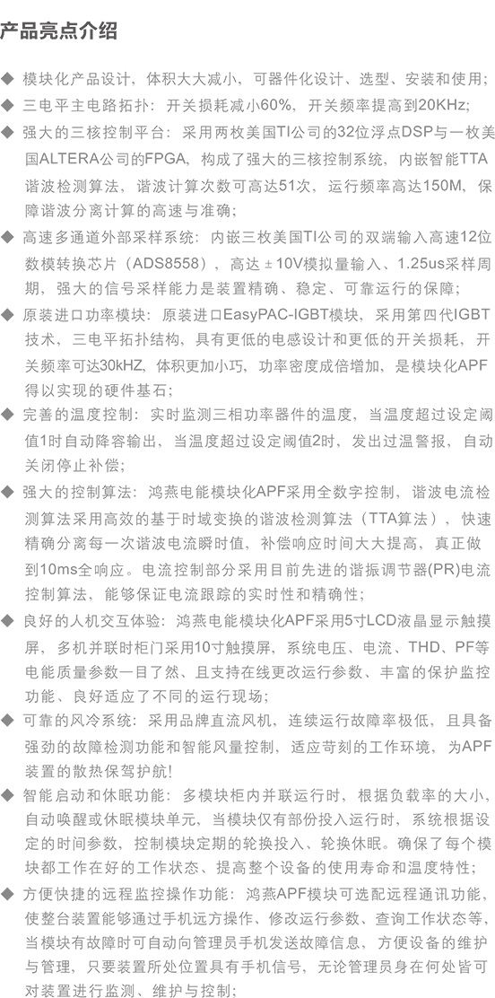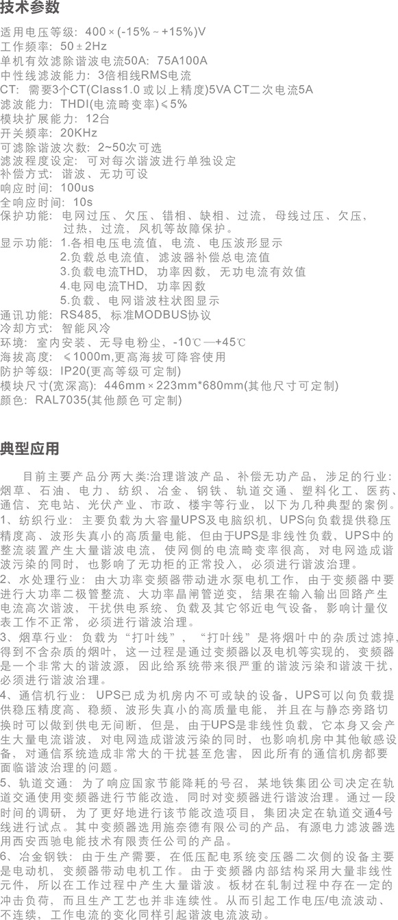 為了進一步滿足不同客戶對于有源電力濾波器的多元化需求,提高用對諧波治理的智能性、便捷性和穩(wěn)定性,公司推出了全新的模塊化三電平有源濾波裝置。 目前主要產(chǎn)品分兩大類:治理諧波產(chǎn)品、補償無功產(chǎn)品,涉足的行業(yè): 煙草、石油、電力、紡織、冶金、鋼鐵、軌道交通、塑料化工、醫(yī)藥、 通信、充電站、光伏產(chǎn)業(yè)、市政、樓宇等行業(yè)